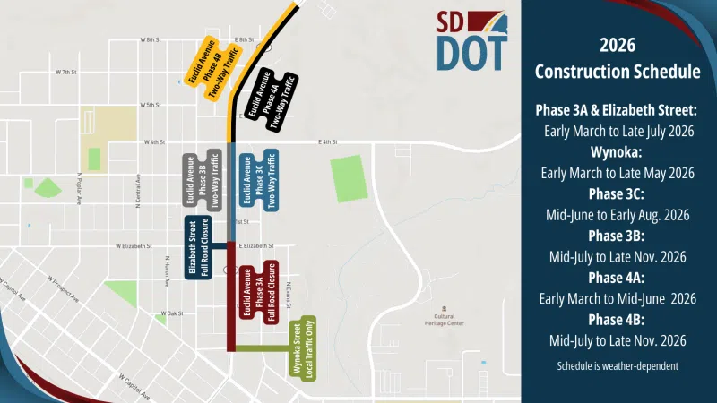 Feb. 25, 2026: The S.D. Highway 1889 (Euclid Avenue) urban reconstruction project within the city of Pierre is scheduled to begin its second year of construction. Weather dependent, work is scheduled ...