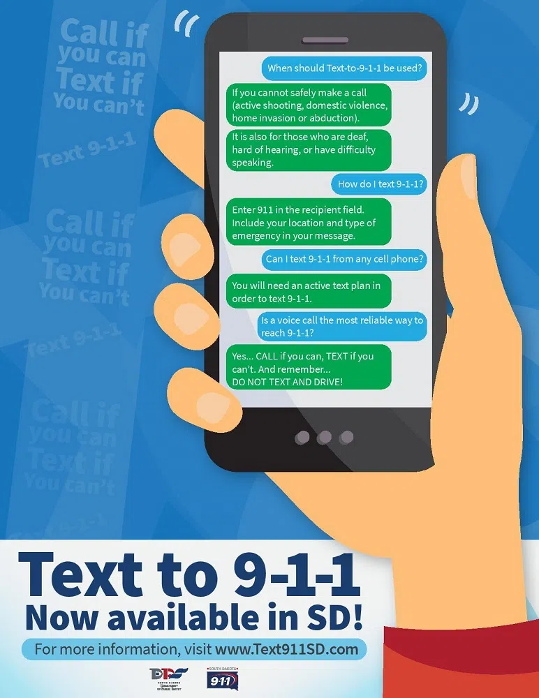 South Dakota Department of Public Safety Secretary Craig Price says Text-to-9-1-1 should only be used in an emergency when you can’t call 9-1-1. He says the Text-to-911 option is good to use if speaking out loud would put the caller in danger or if the caller is deaf, hard-of-hearing or speech impaired.