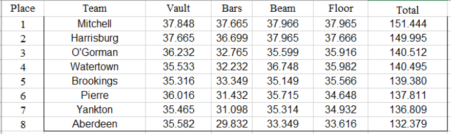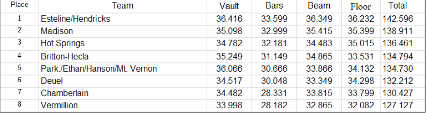 The Class A State Championship was won by Estelline/Hendricks who scored a 142.596 team score. Madison was second with a 138.911 and Hot Springs finished third with a 136.461. Britton/Hecla edged out Park/Ethan/Hanson/Mt. Vernon for 4th place 134.794 to 134.730. Deuel was 6th in the team standings with a 132.212 followed by Chamberlain in 7th place with a 130.427 team scored and Vermillion wo finished 8th with a 127.127 score.