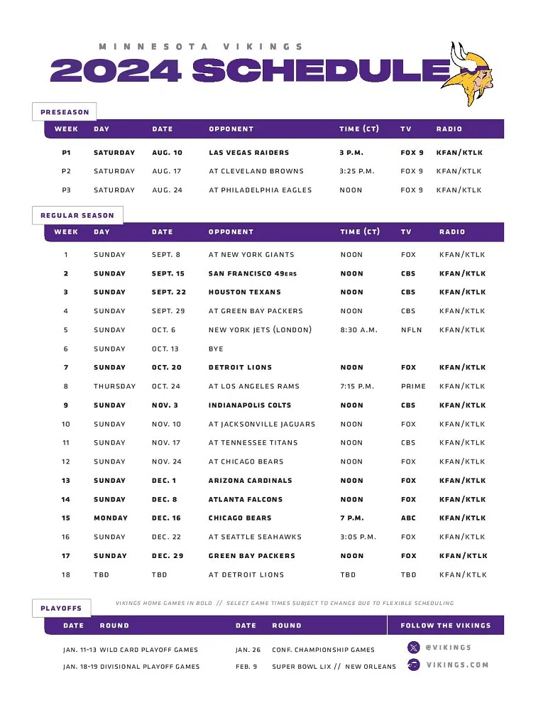 The schedule is out and the Minnesota Vikings will host eight games at U.S. Bank Stadium during the 2024-25 season. They’ll also have eight road games and one game in London at the Tottenham Hotspur Stadium.