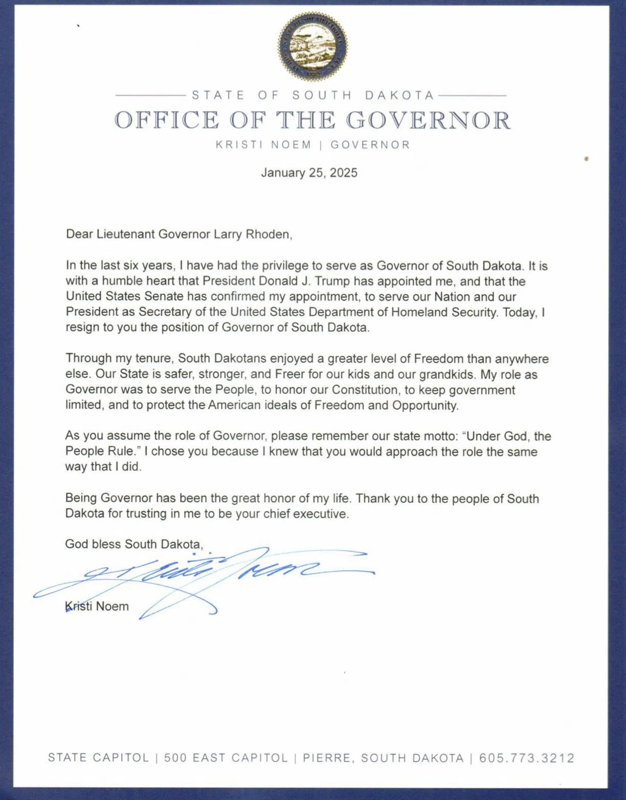 Today (Jan. 25, 20250, Larry Rhoden received Kristi Noem’s resignation as Governor and succeeded to the office of Governor of South Dakota. Larry Rhoden is now the 34th Governor of South Dakota pursuant to Article 4 Section 6 of the South Dakota Constitution.