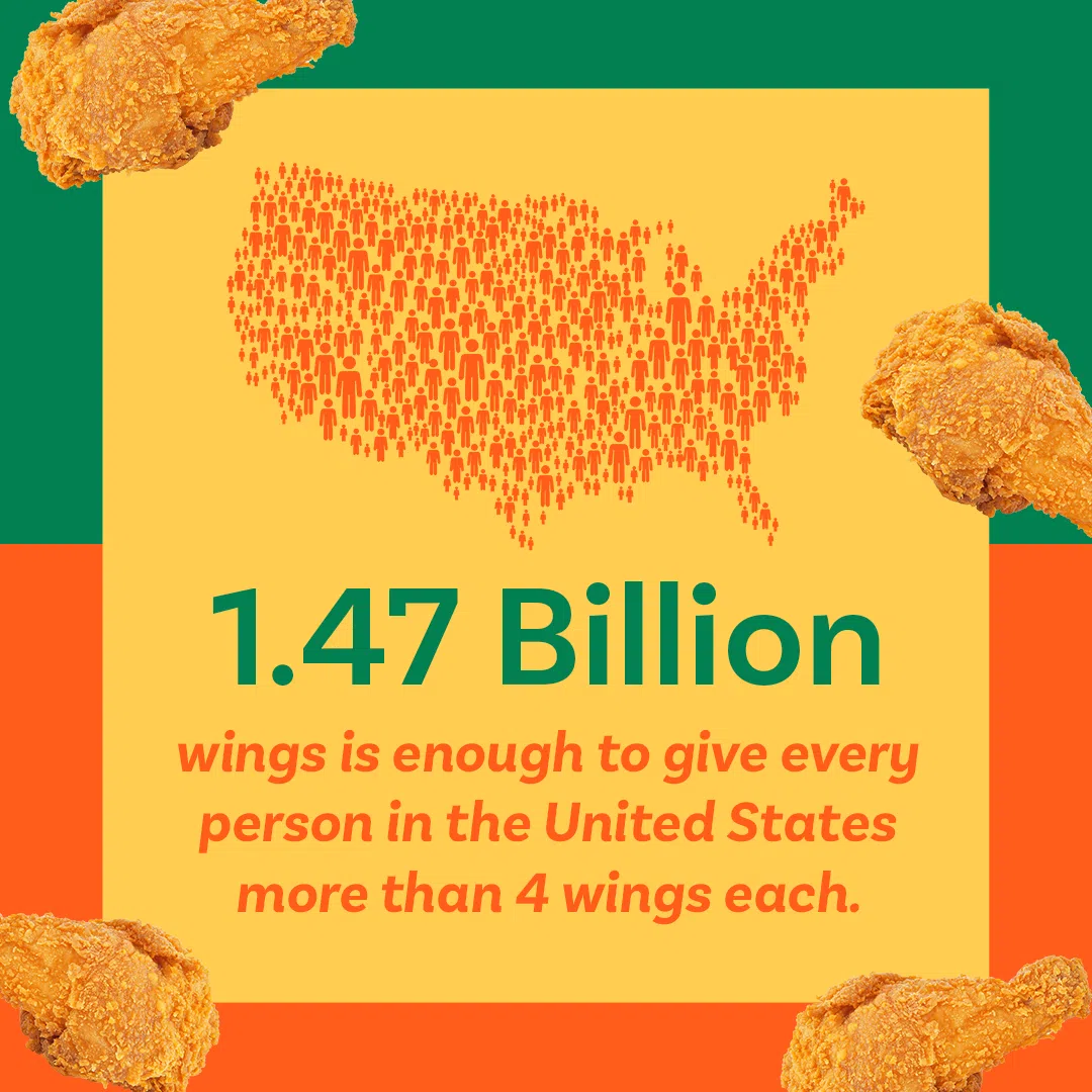- 1.47 billion wings laid end to end would stretch to and from GEHA Field at Arrowhead Stadium in Kansas City, Mo. to Lincoln Financial Field in Philadelphia, Pa. about 63 times.