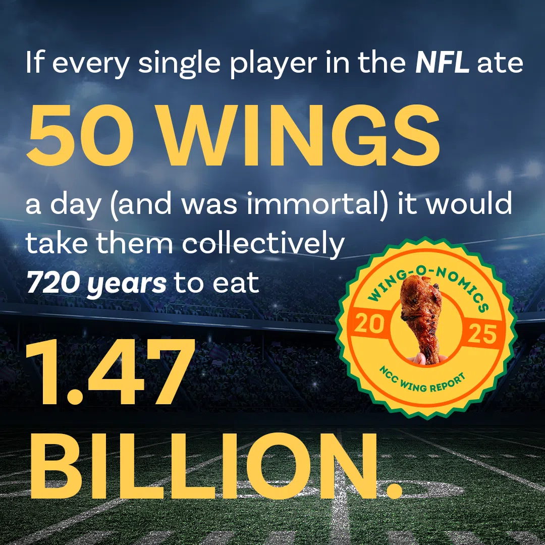 - If every single player in the NFL ate 50 wings a day (and was immortal) it would take them collectively 720 years to eat 1.47 billion.