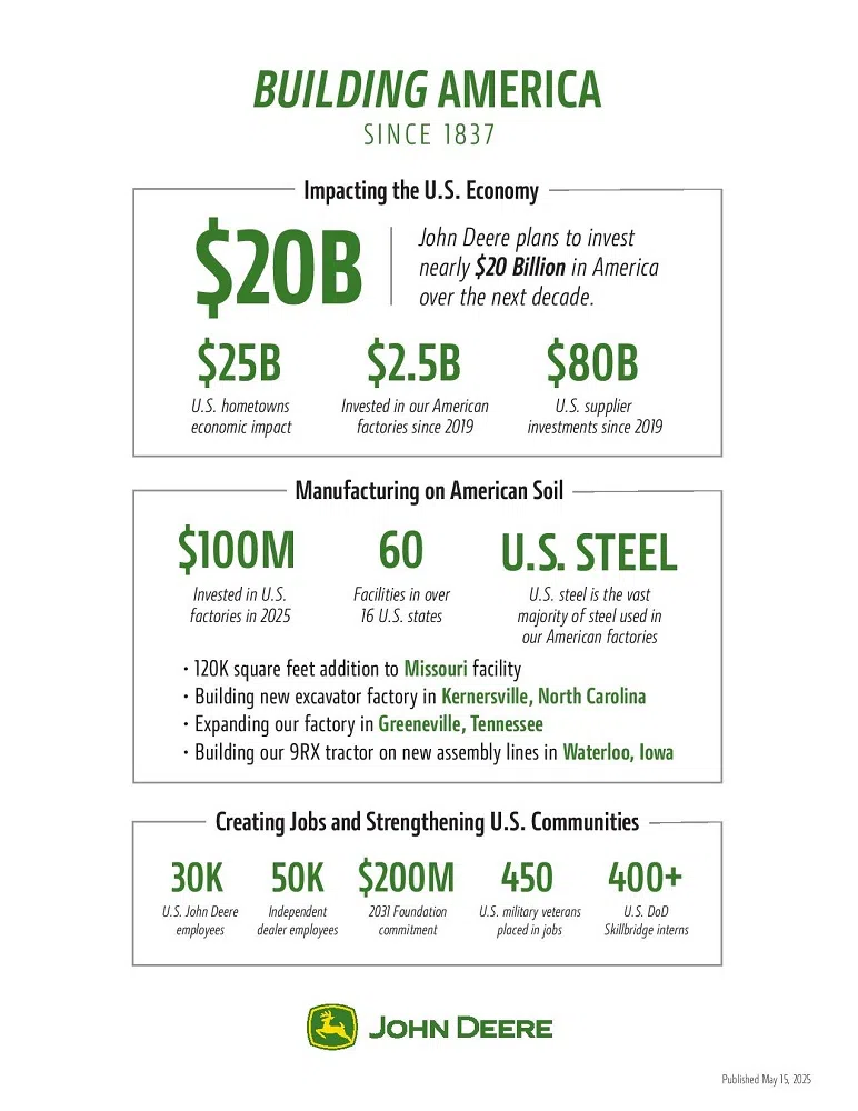 During the company’s 2Q 2025 earning’s call (May 15, 2025), John Deere chairman and CEO John May announced a commitment to invest $20 billion in the United States over the next 10 years, underscoring the continued dedication of John Deere to American workers, communities and manufacturing. John Deere has helped build America since 1837 and this announcement reinforces the company’s ongoing commitment to strategic investments both for today and the future.