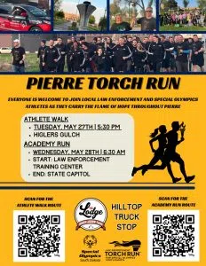 Today kicks off the Pierre Torch Run for Special Olympics and local law enforcement. Tonight’s event will be the Special Olympics athlete walk with the Pierre Wildcats which will feature both groups walking the flame of hope throughout Pierre. Tonight’s walk begins at 5:30 PM at Hilgers Gulch.