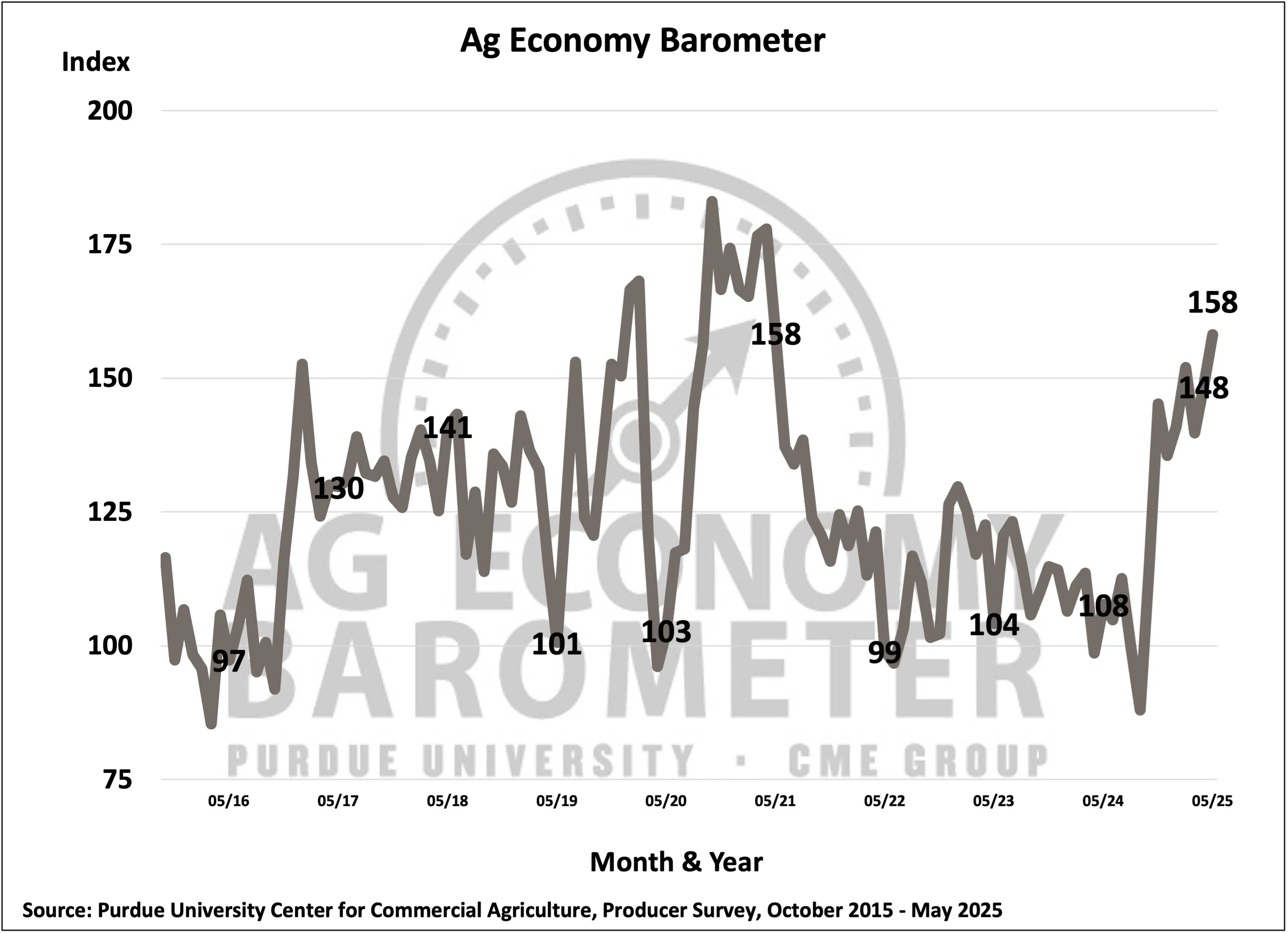 Farmer sentiment improved for the second consecutive month in May 2025, reaching its highest level since May 2021. The Purdue University/CME Group Ag Economy Barometer rose 10 points to a reading of 158, up from 148 in April. Both the Index of Current Conditions and the Index of Future Expectations contributed to the increase, with the current conditions index up 5 points to 146 and the future expectations index jumping 12 points to 164. The sentiment boost was driven by a more optimistic outlook on U.S. agricultural exports and a less negative view of how tariffs will impact farm income in 2025. The May barometer survey took place May 12-16.