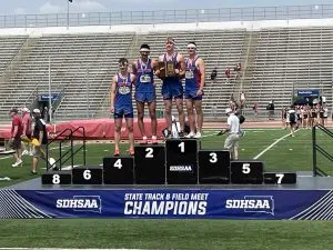 Thune was walking along the track and passed by the Coyotes tent before Aubrie Norman noticed him passing by and waved him down. Thune saw Norman and said, “I’ve been looking for you guys!” Thune was kind enough to pose for photos with the team, while not only congratulating Schoon but also all of the Coyotes on an incredible season, and a great weekend at State. Even though Schoon took second in the event he broke Thune’s school record in, he did end up finding his way to the top of the podium after he, Thad Kierl, Bryer Kinsley and Asa Best took first in the 4×400 relay event. Thune proudly posed with them as well after that accomplishment.