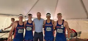 Thune was walking along the track and passed by the Coyotes tent before Aubrie Norman noticed him passing by and waved him down. Thune saw Norman and said, “I’ve been looking for you guys!” Thune was kind enough to pose for photos with the team, while not only congratulating Schoon but also all of the Coyotes on an incredible season, and a great weekend at State. Even though Schoon took second in the event he broke Thune’s school record in, he did end up finding his way to the top of the podium after he, Thad Kierl, Bryer Kinsley and Asa Best took first in the 4×400 relay event. Thune proudly posed with them as well after that accomplishment.