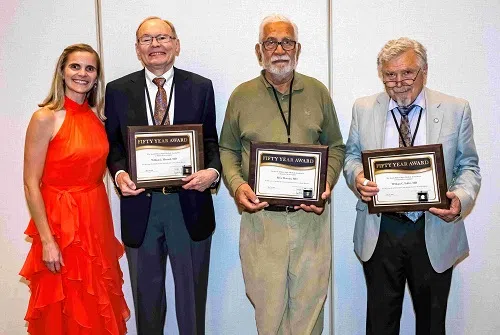50-Year Awards left to right: SDSMA Immediate Past President Jen Tinguely, MD, MPH presented SDSMA 50-Year Awards to William Howard, MD; Rif’at Hussain, MD; and William Fuller, MD.
