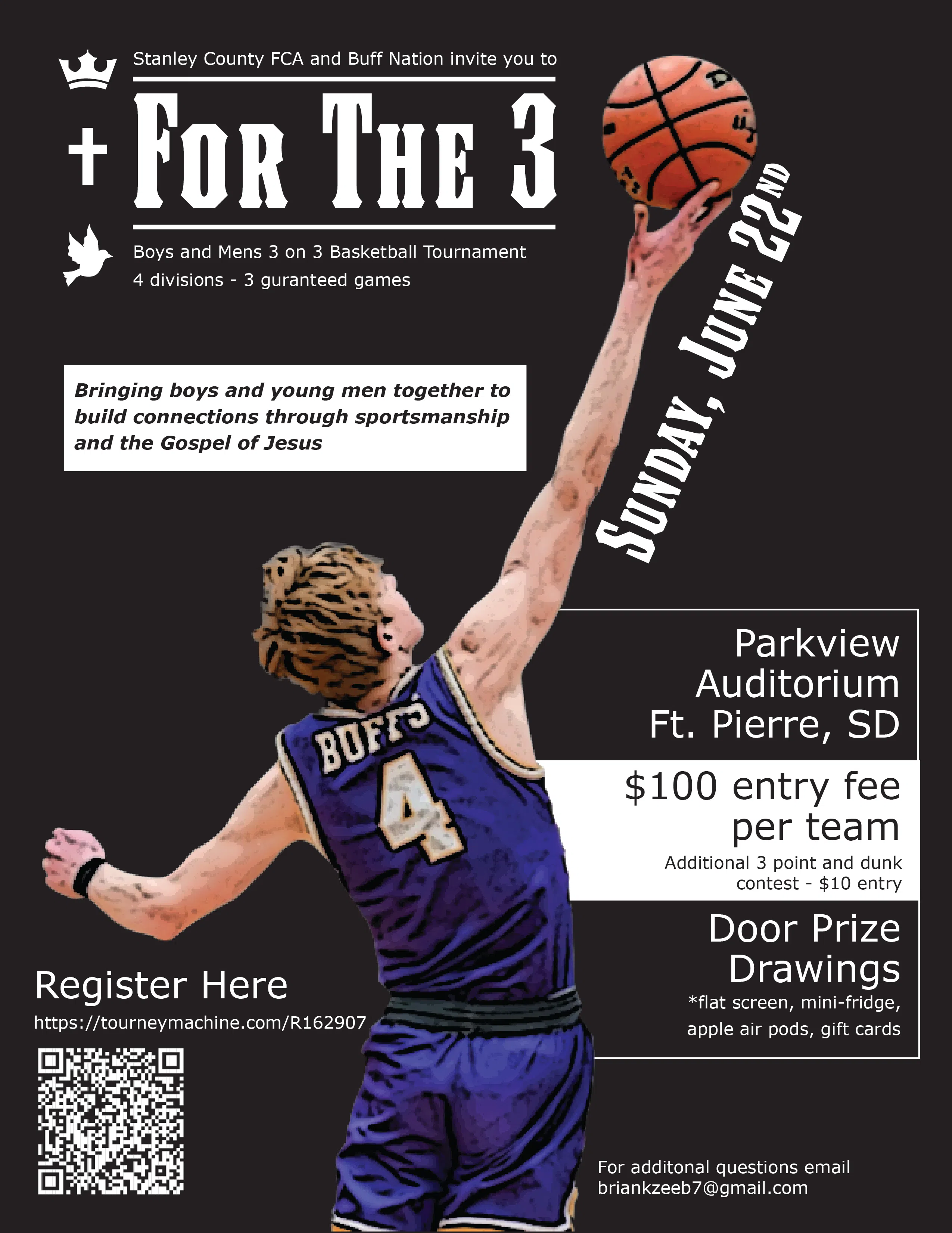 Stanley County Fellowship of Christian Athletes, Buff Nation and the Stanley County Booster Club would like to invite you to a competitive 3 on 3 boys and men’s basketball tournament FUNDRAISER on Sunday June 22nd, 2025, at Parkview Auditorium in Ft. Pierre, South Dakota. This is also Oahe Days Weekend in Pierre and the Stanley County All School Reunion. The focus of this event is to bring young men together to build connections through sportsmanship and the Gospel of Jesus.