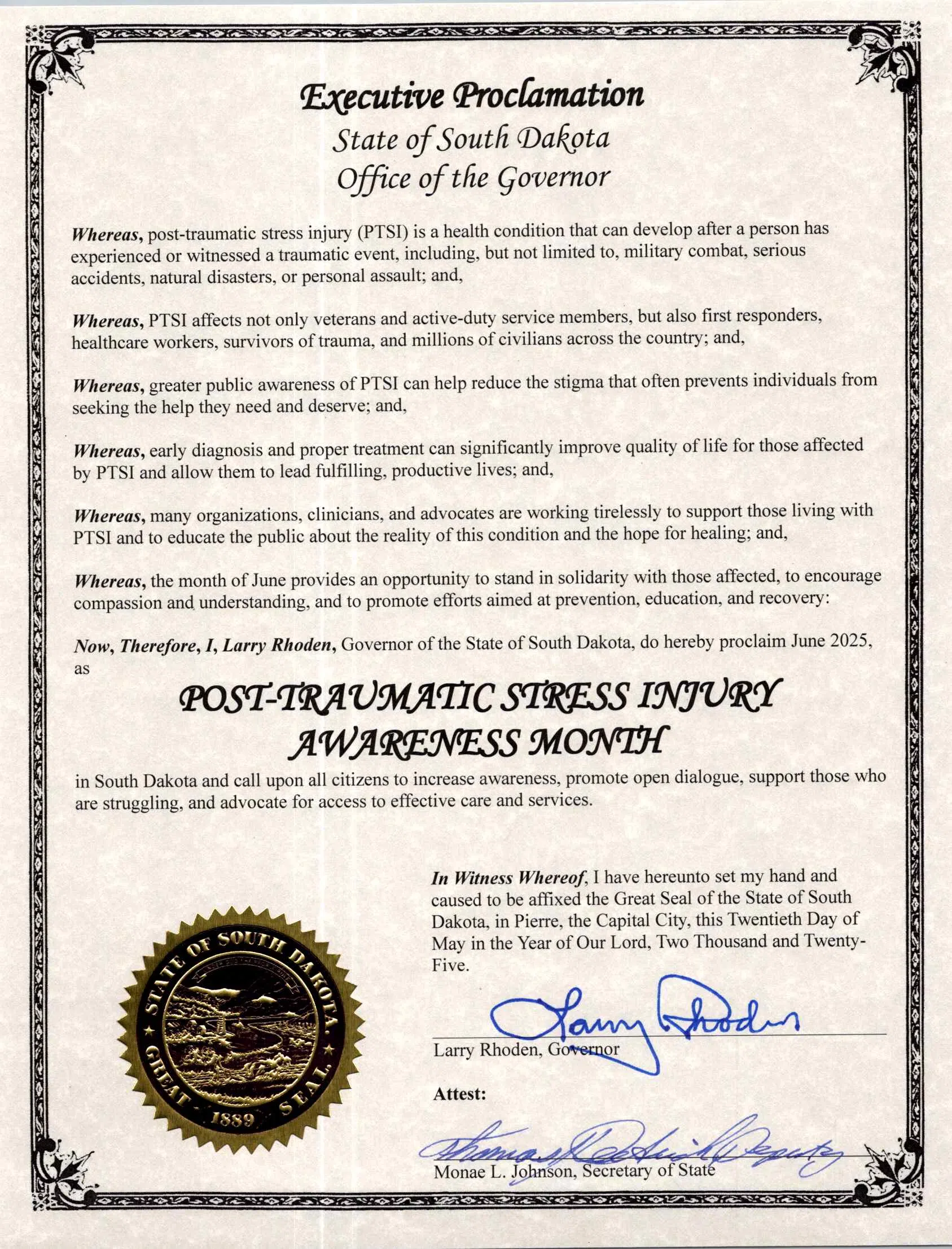 In recognition of the invisible wounds carried by many of our veterans, service members, first responders, and survivors of trauma, South Dakota Governor Larry Rhoden has officially proclaimed the month of June as Post-Traumatic Stress Injury Awareness Month (PTSIA).