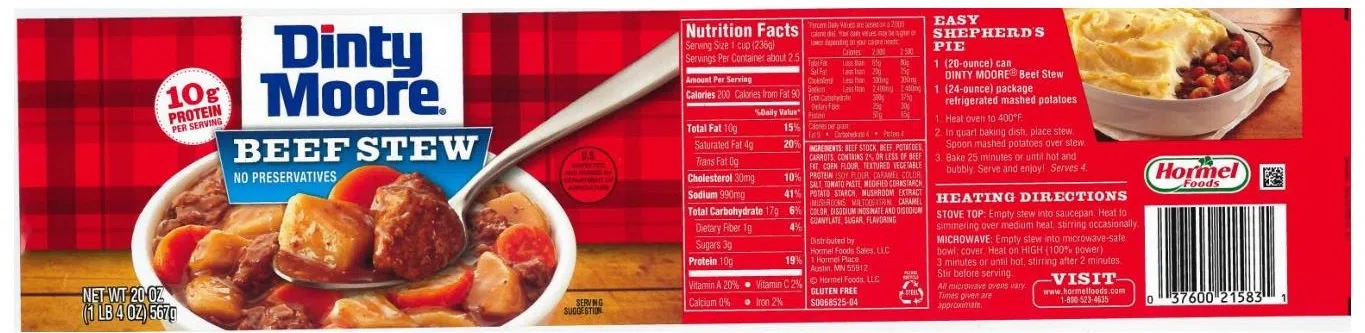 - 20-oz. metal cans containing “Dinty Moore BEEF STEW” with “BEST BY FEB 2028” and lot code “T02045” printed on the can. The lot code may have an additional number at the end.