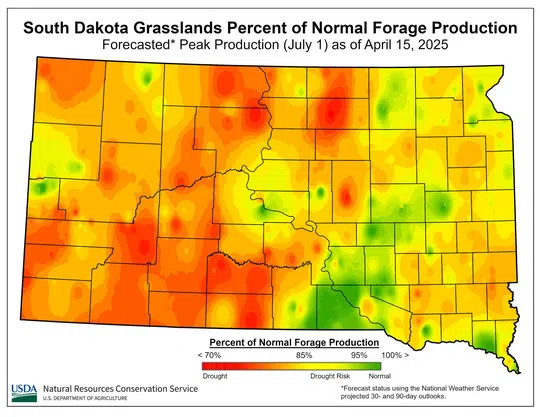 South Dakota (SD) grasslands continue to face dry conditions as illustrated in the mid-April SD Grassland Productivity Map on the SD Natural Resources Conservation Service (NRCS) website under Range and Pasture. As a product of the SD Drought Tool, these maps utilize a two-year weighted average of precipitation data to determine a percent of normal production calculation incorporating historical clipping data from across the state.