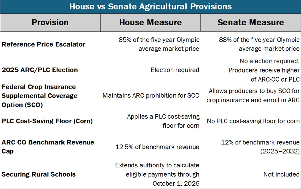 In addition, there are a few key differences between the House and Senate text. First, while the Senate keeps the updated reference prices from the House version, the Senate text increases the PLC reference price escalator calculation to 88% compared to the current 85%. Remember, this is the provision included in the 2018 Farm Bill that can adjust the effective reference price based on past market prices. The Senate also addresses the current crop year already in progress and allows producers to automatically receive the higher of the ARC-CO or PLC payment without having to make an election for the 2025 crop year. Additionally, the Senate does not move forward a House plan for a PLC cost-saving floor for corn that would limit support when market prices are high. Both versions improve ARC-CO by increasing the benchmark revenue cap, though the Senate increased the cap to 12%, while the House set it at 12.5% for crop years 2025 through 2032.