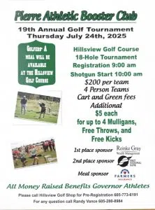 The Pierre Athletic Booster Club will be hosting it’s 19th Annual Golf Tournament on July 24th at Hillsview Golf Club. To get registered and learn more, please see the flyer below.