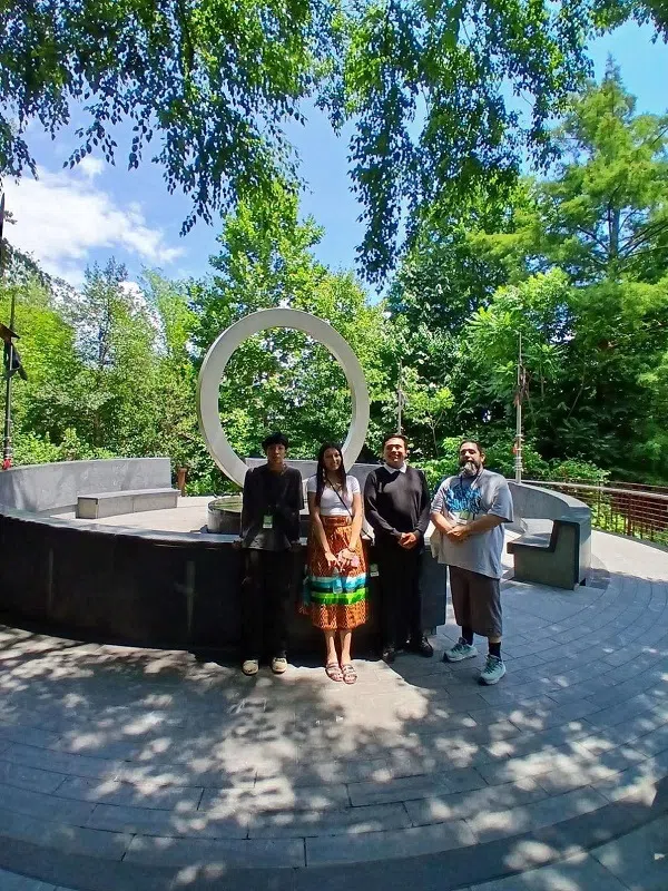 (L-R) Youth artists Antonio Eagle Bear and Kai’Len Turning Heart with chaperone Wambli Quintana and instructor-mentor Hoka Skenandore at the National Native American Veterans Memorial in Washington, D.C.