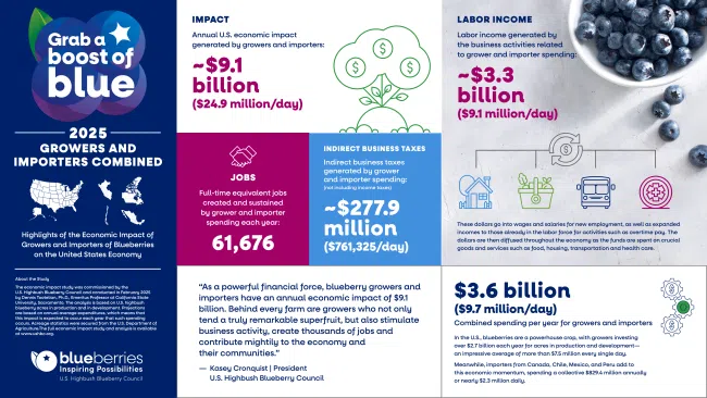 Blueberry growers and importers deliver a powerhouse crop that contributes nearly $9.1 billion in annual economic impact to the U.S. economy, or nearly $25 million every day, according to new reports from the U.S. Highbush Blueberry Council (USHBC).