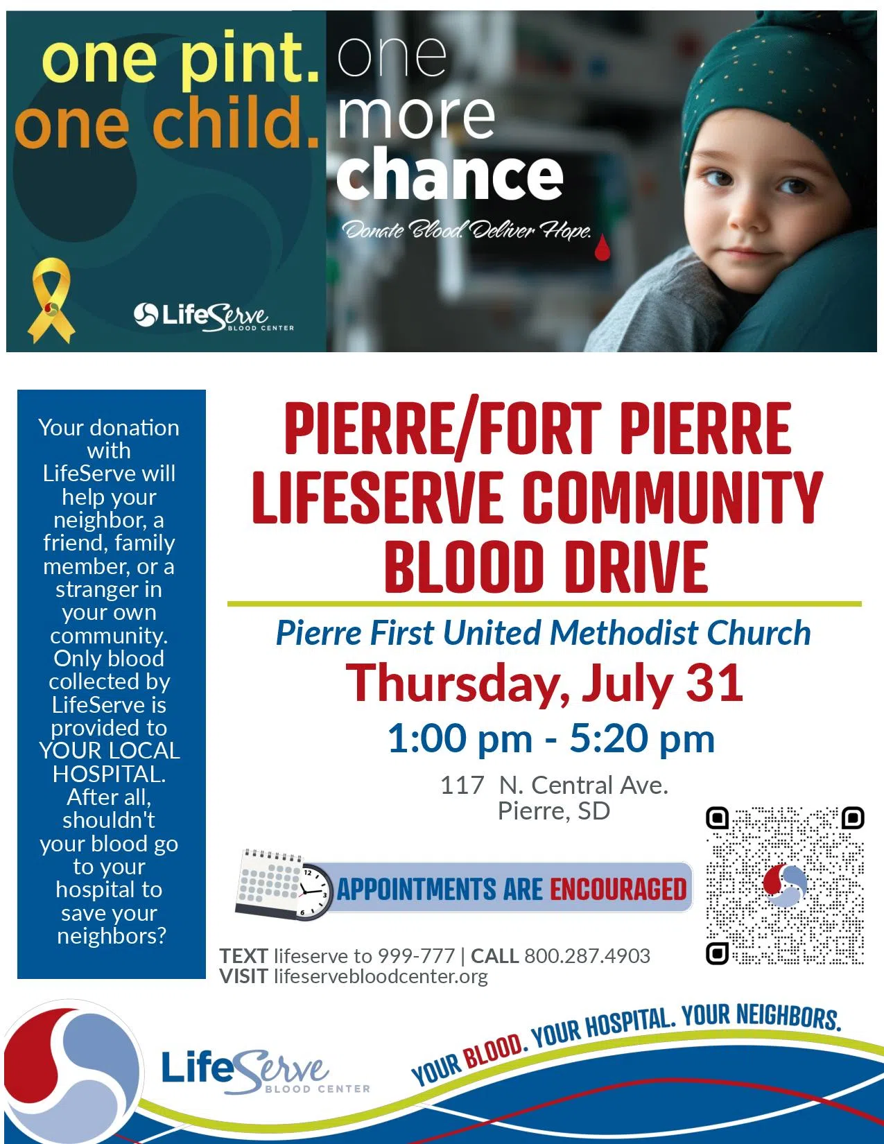Then on July 31 from 1-5:20pm, LifeServe will hold a blood drive at the First United Methodist Church in Pierre.