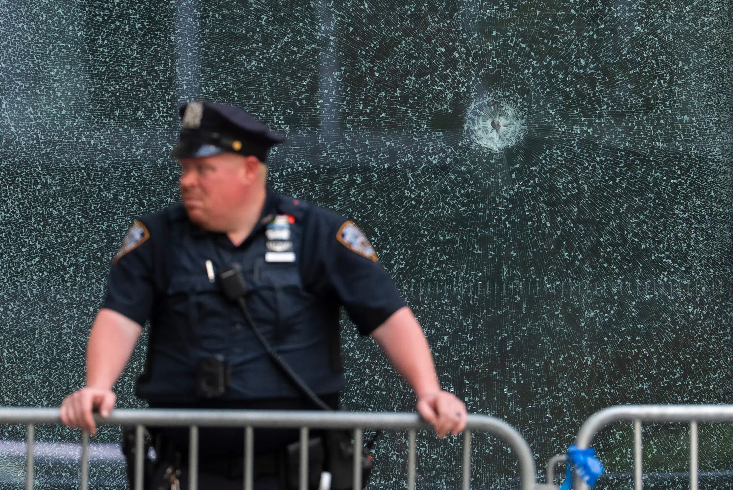 An NYPD officer stands in front of glass shattered from a bullet hole at the scene of Monday's deadly shooting, Tuesday, July 29, 2025, in New York. (AP Photo/Yuki Iwamura)