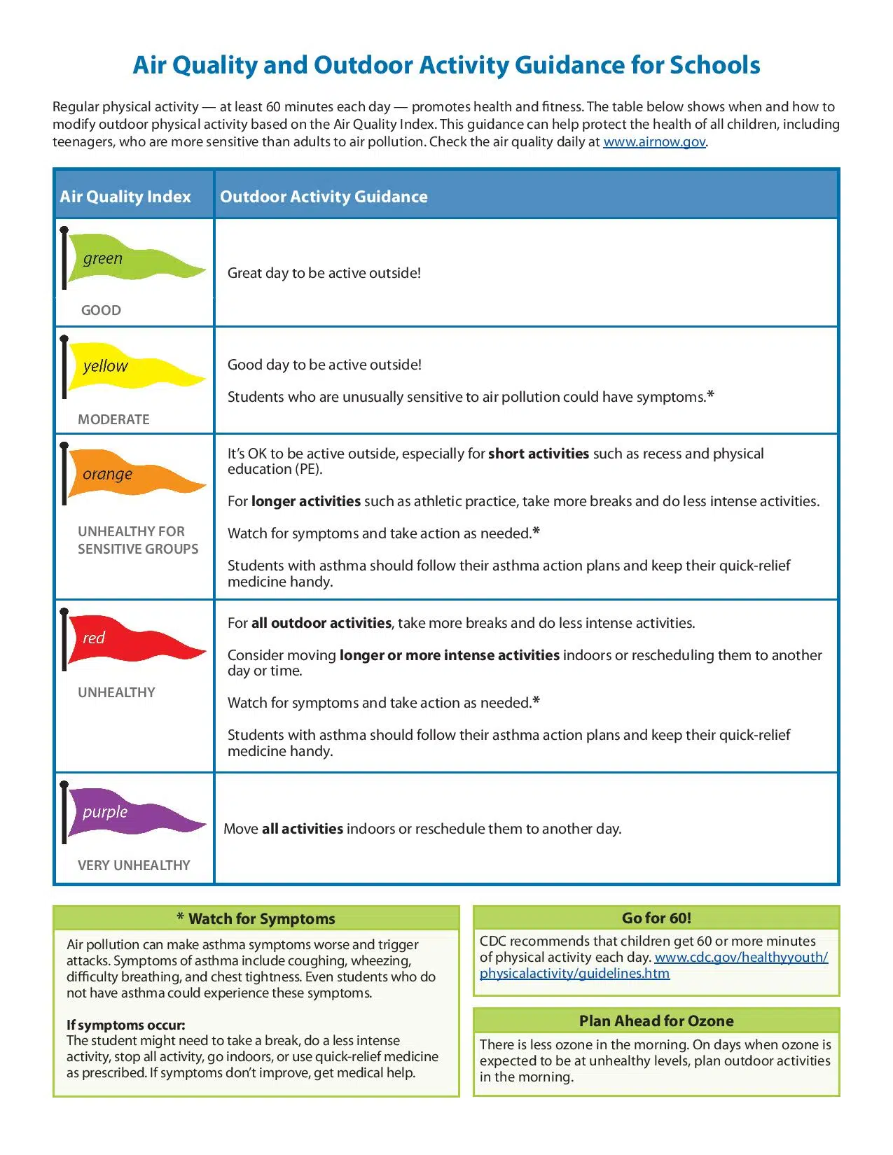 For an easy-to-use outdoor activity and air quality guide created by the EPA and CDC for use by schools, daycares, and summer camps visit https://www.airnow.gov/