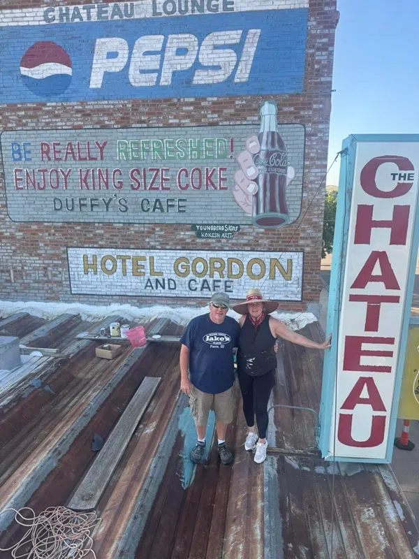 Local artist Jill Kokesh completed the restoration of the original signage on the side of the historic Gordon Hotel, now home to the Chateau Lounge & Conference Center. Owner Shane Mattheis had done a lot of work on his building, which enabled the ghost mural to be completed. Jill Kokesh’s brother Rick Kokesh, a carpenter, helped her with the project, which they finished in about five days.