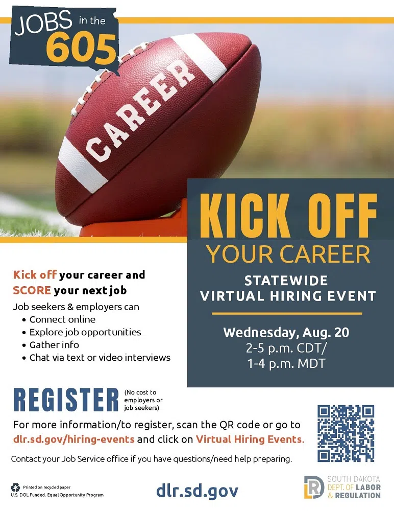 The South Dakota Department of Labor and Regulation is hosting a statewide virtual hiring event Wednesday (Aug. 20, 2025) from 2-5pm CDT/1-4pm MDT.