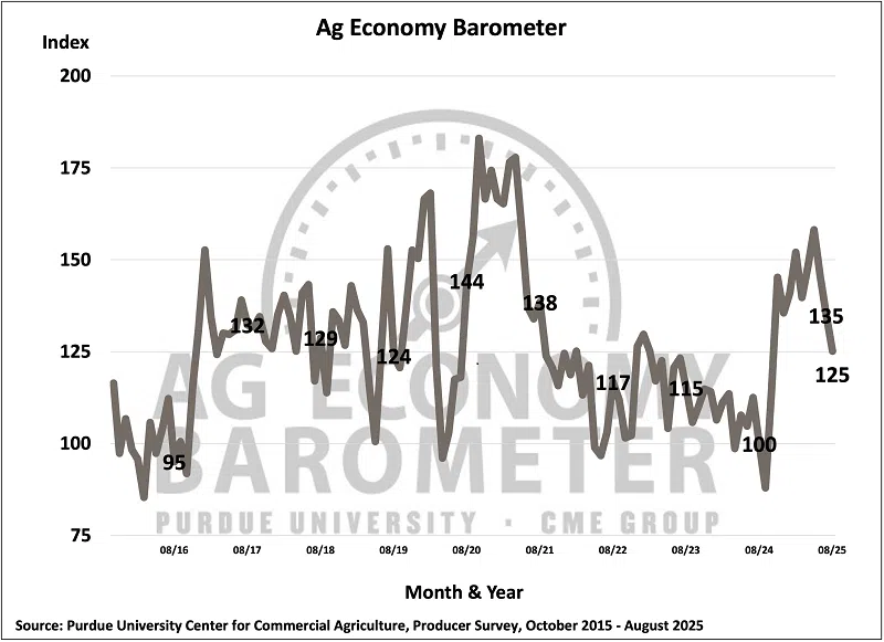 Farmer sentiment dipped for the third straight month in August 2025, with the Purdue University/CME Group Ag Economy Barometer Index falling 10 points to 125. Producers expressed markedly less optimism about the future, as reflected in the Index of Future Expectations, which fell 16 points to 123. This marks the lowest reading for the future index since last September. Producers’ perspective on current conditions changed little this month, as the Current Conditions Index rose 2 points from July to 129. Sentiment differed widely among producers according to whether their operations focused mainly on crops or livestock. Crop producers responded with much less optimism than their livestock counterparts, reflecting the profitability disparity between the two enterprises. Beef cattle operations in particular are experiencing record profitability as the smallest cattle inventory since 1951 has pushed cattle prices to record levels. This stands in sharp contrast to returns for crop production, which have weakened in 2025. The August barometer survey took place from Aug. 11-15, 2025.