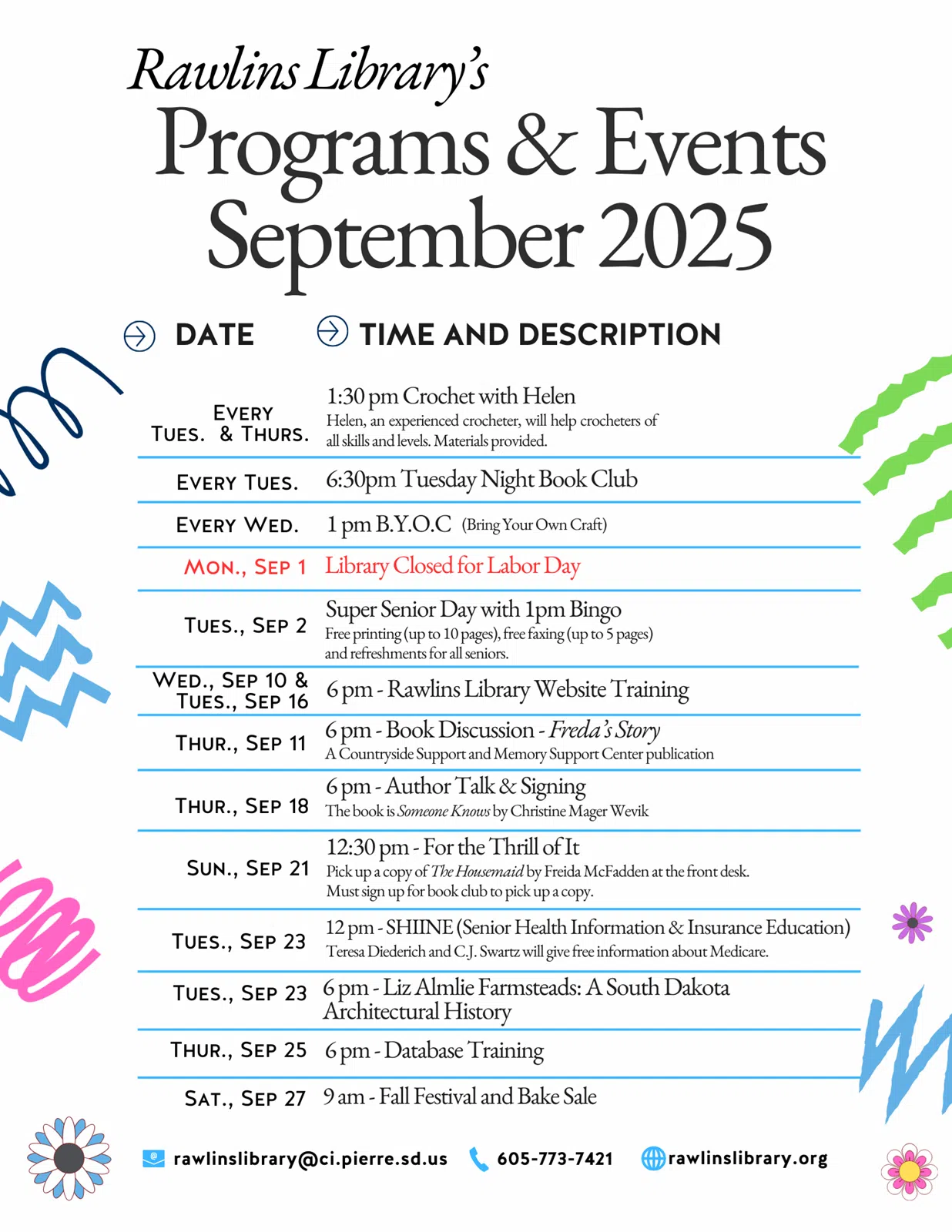 Abby Edwardson with Rawlins Library in Pierre joined KGFX to talk about their September events. https://media-cdn.socastsrm.com/wordpress/wp-content/blogs.dir/2626/files/2025/09/piyn-090525.mp3