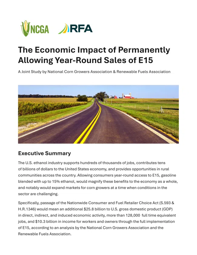 A new economic study released this week (Sept. 15, 2025) by the National Corn Growers Association and the Renewable Fuels Association shows that expanding year-round, nationwide consumer access to fuels with a 15% ethanol blend would provide a boon to the American economy, benefiting farmers, communities and consumers alike.