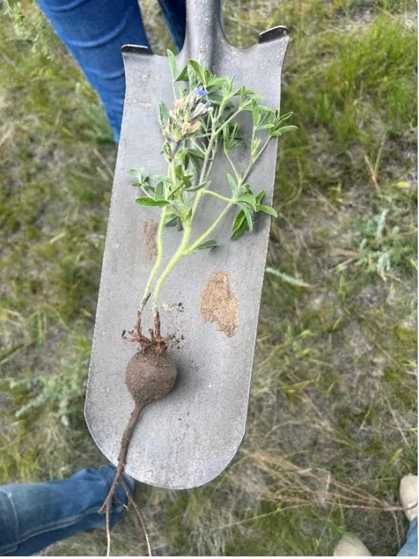 The group also got hands-on experience harvesting prairie turnips, also known as timpsila or Indian breadroot scurfpea. Above ground, this extra hairy plant has small blueish-purple flowers and a palmate leaf structure. Below ground a tap root reveals a large tuber, up to the size of an egg. This tuber is what can be harvested to eat.