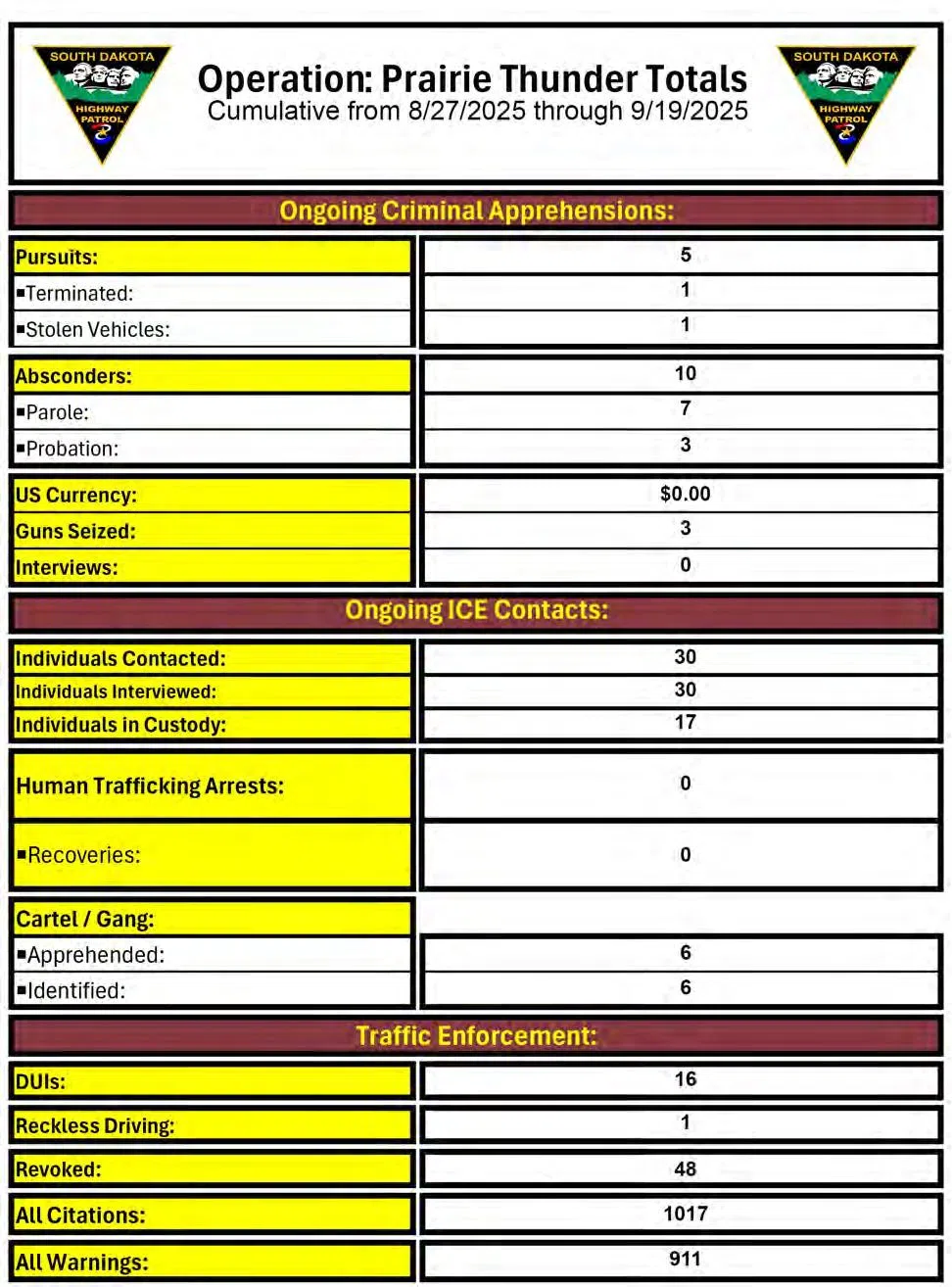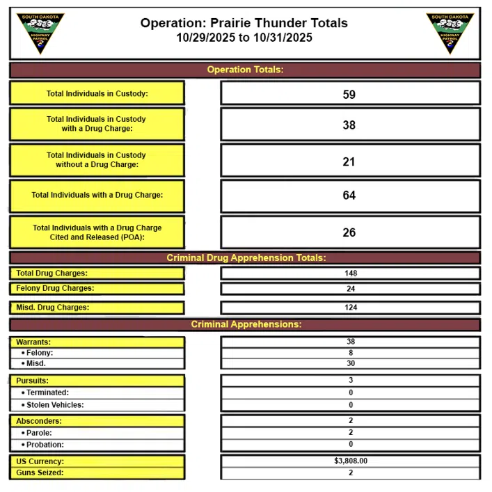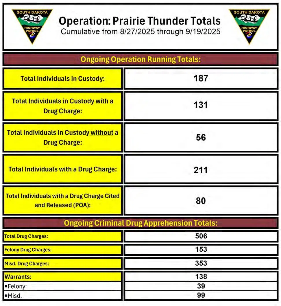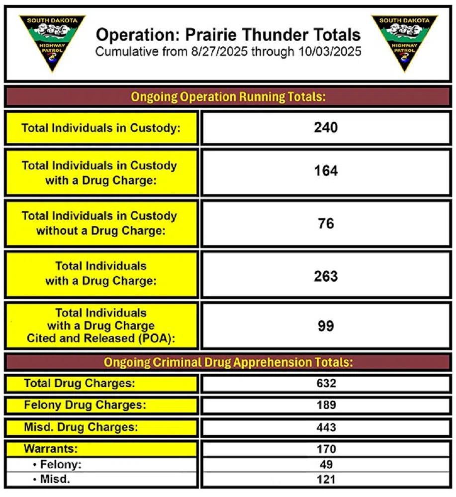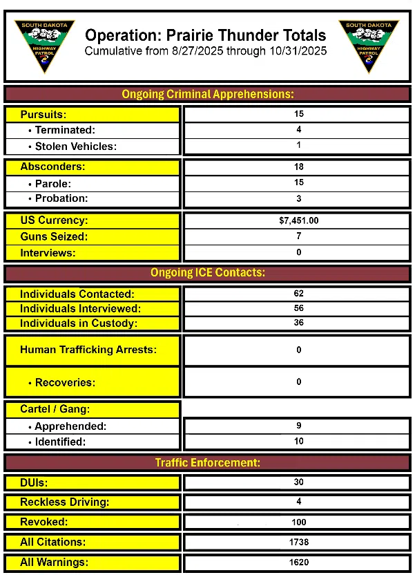 “We continue to take great strides in our mission to keep South Dakota strong, safe, and free,” said Governor Larry Rhoden. “All of the departments and agencies involved in Operation: Prairie Thunder are making progress on their missions. I am confident that their efforts will lead to a safer future for our communities.”