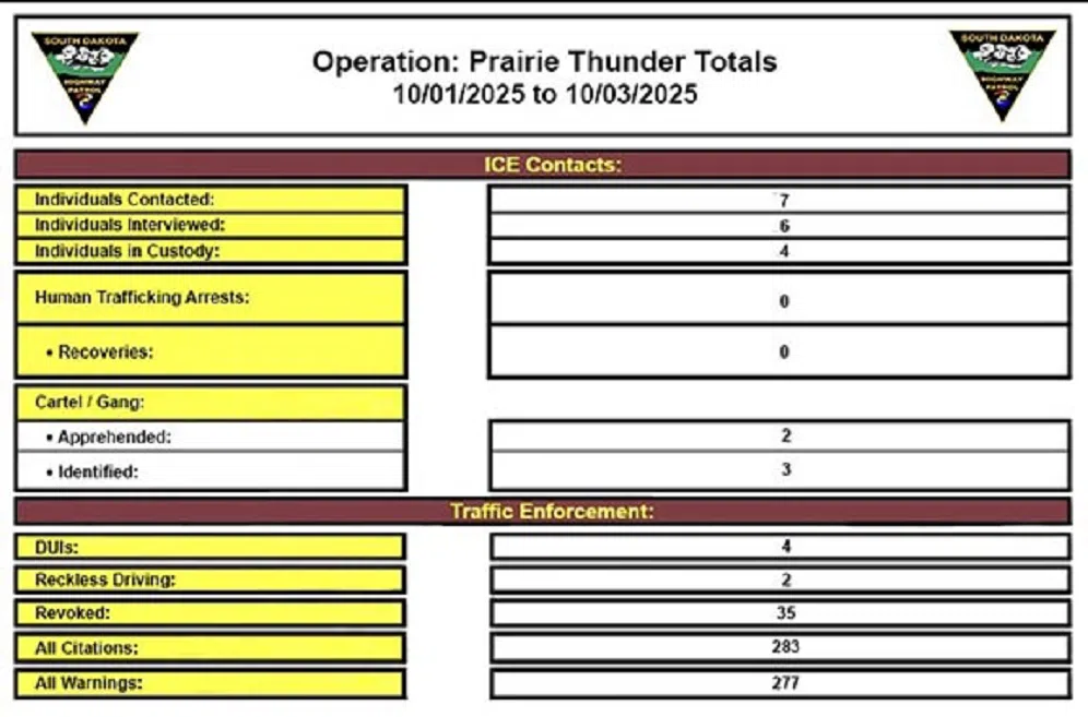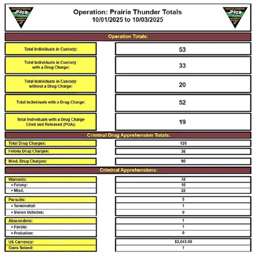 A fourth set of saturation patrols in the Sioux Falls area concluded Friday (Oct. 3, 2025) as part of South Dakota’s Operation: Prairie Thunder.