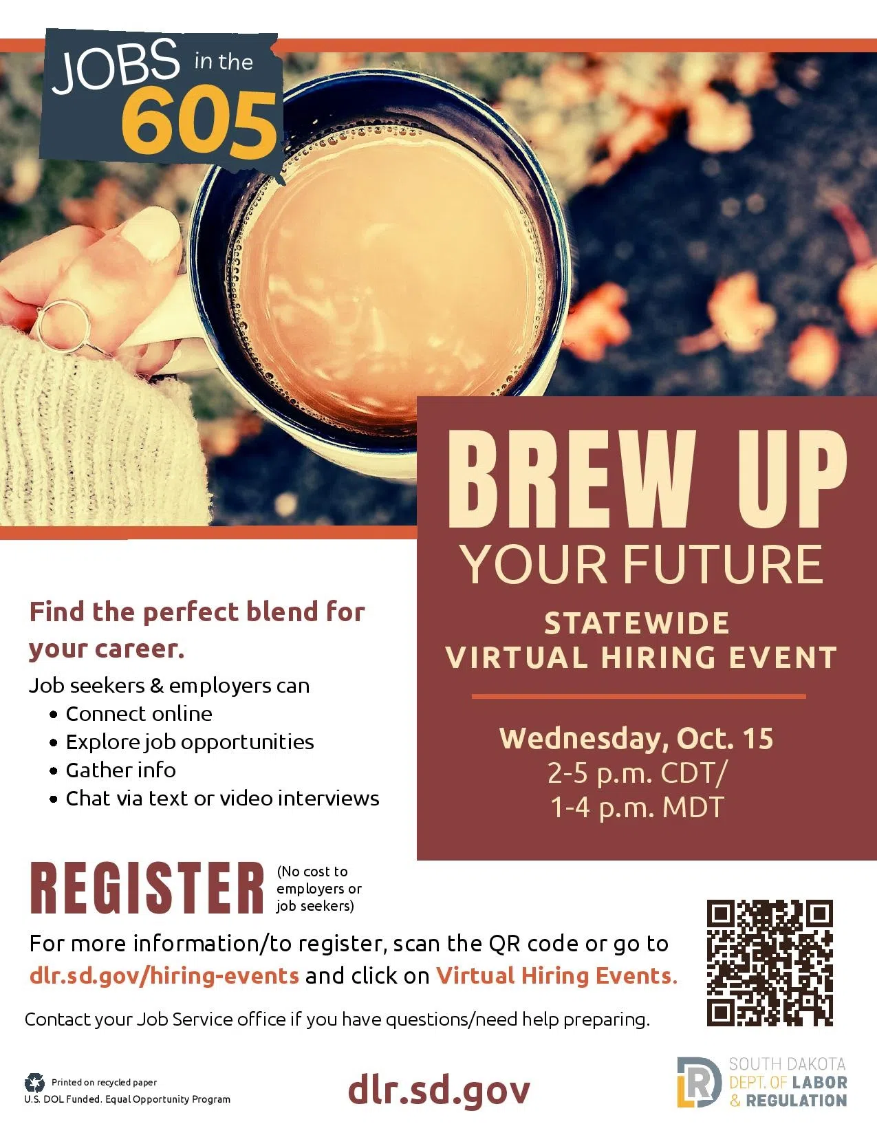 The South Dakota Department of Labor and Regulation is hosting a statewide virtual hiring event on Wednesday (Oct. 15, 2025) from 2-5 p.m. CDT (1-4 p.m. MDT).