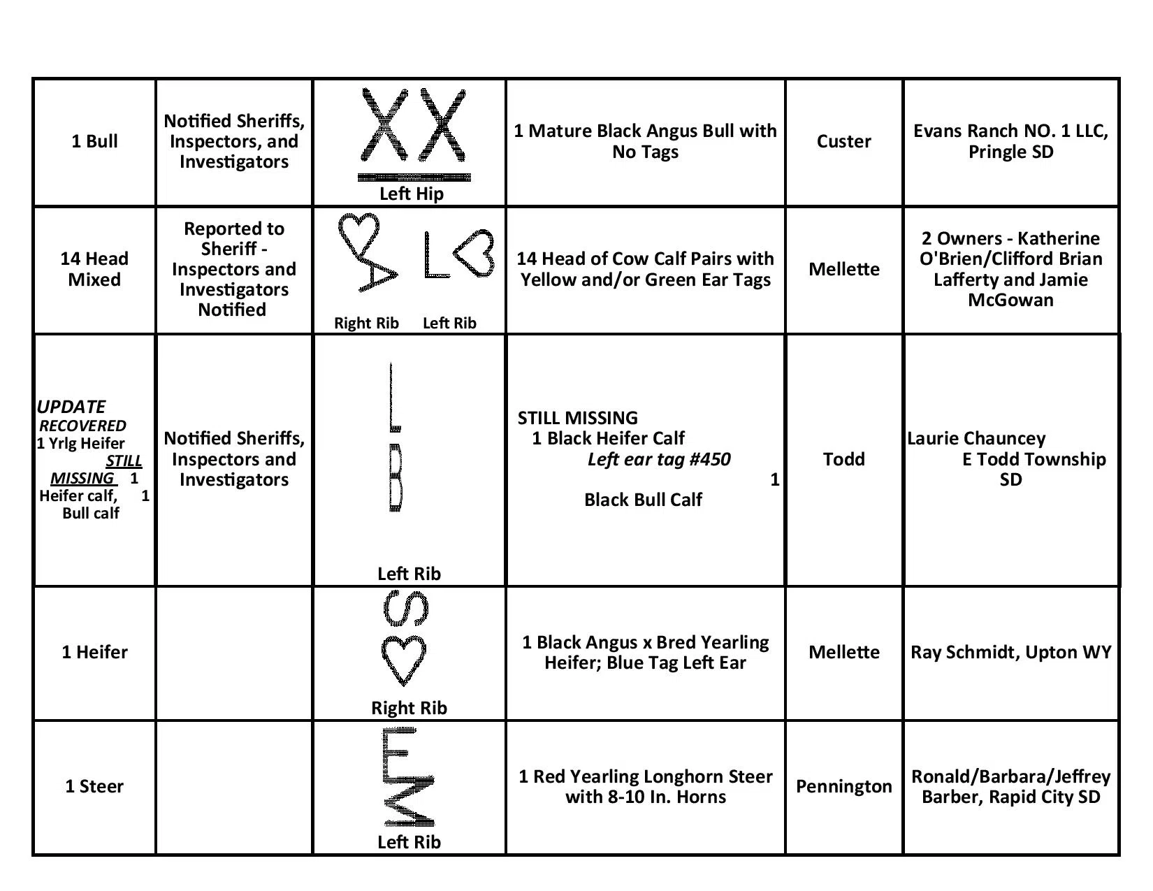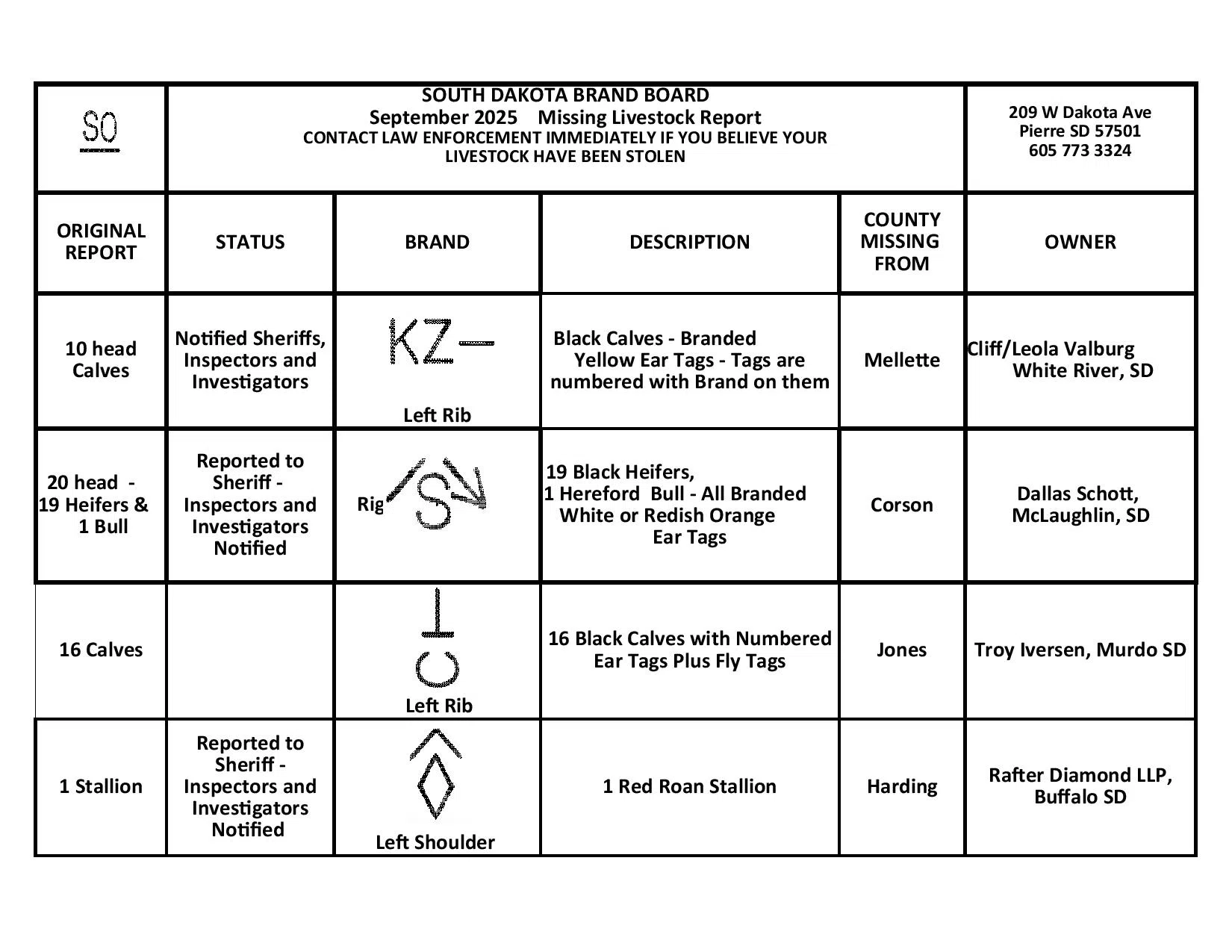 The South Dakota Brand Board received reports of stolen cattle last month (Sept. 2025) from seven counties, including Jones, Mellette and Todd counties in the central part of the state.