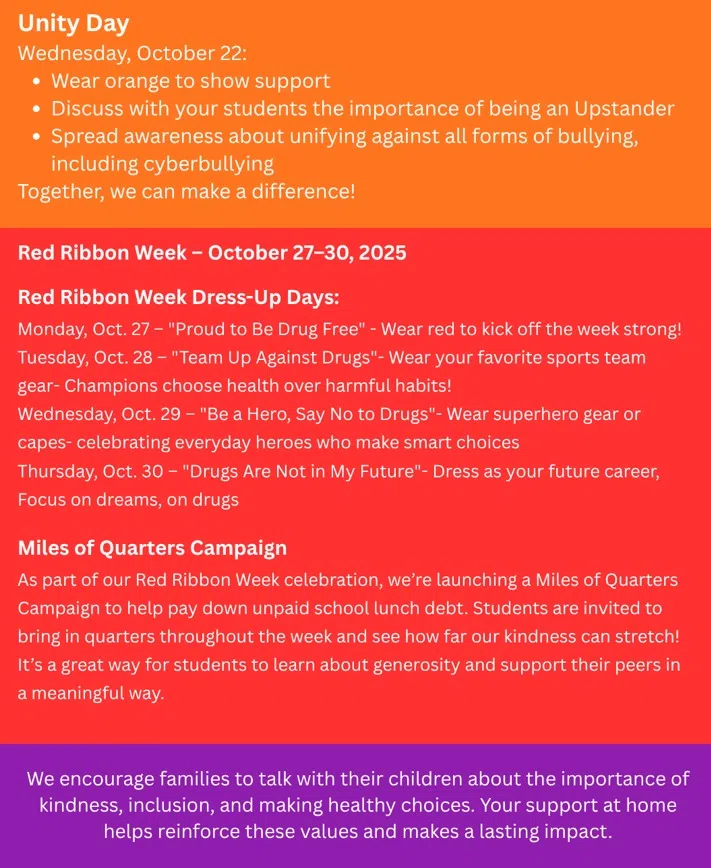 Additionally, next week (Oct. 27-30, 2025) is Red Ribbon Week and Hahn says the school is doing a “Miles of Quarters” campaign.
