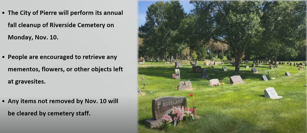 The City of Pierre will perform its annual fall cleanup at Riverside Cemetery on Monday (Nov. 10, 2025).
