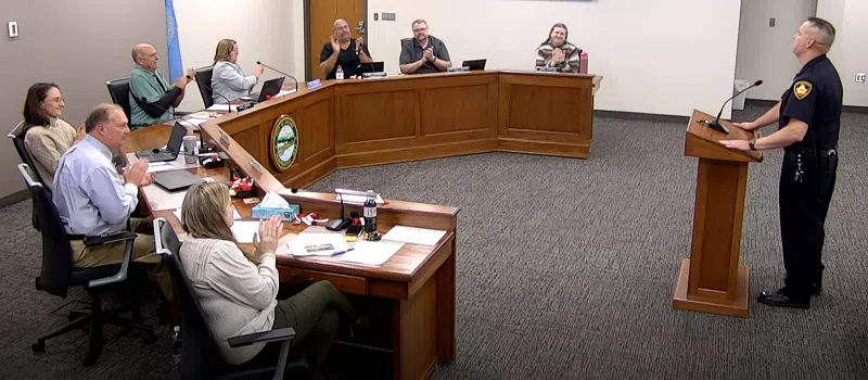 Pierre city commissioners and city officials applaud after hearing from retiring Police Chief Jason Jones. Jones will retire on Nov. 7, 2025.