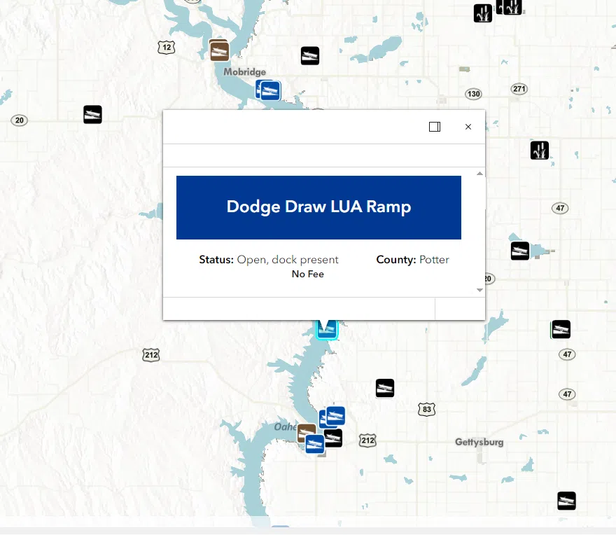 Image is a screenshot of a South Dakota Game, Fish and Parks map of public boat ramps.