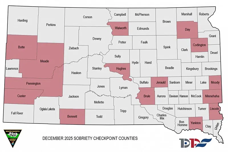 The South Dakota Highway Patrol has announced sobriety checkpoints will be conducted in 15 different counties during the month of December.