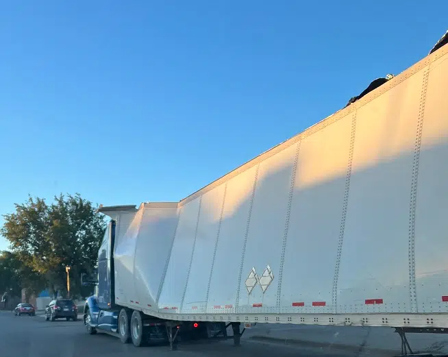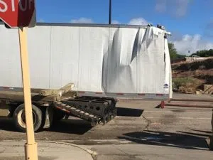 Semi tractor and trailer after hitting the train bridge on South Pierre Street in Pierre Oct. 13, 2022.