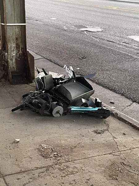 A southbound pickup pulling a camper drove under the train bridge in Pierre Nov. 30, 2021, losing the air ventilation system unit on the top.