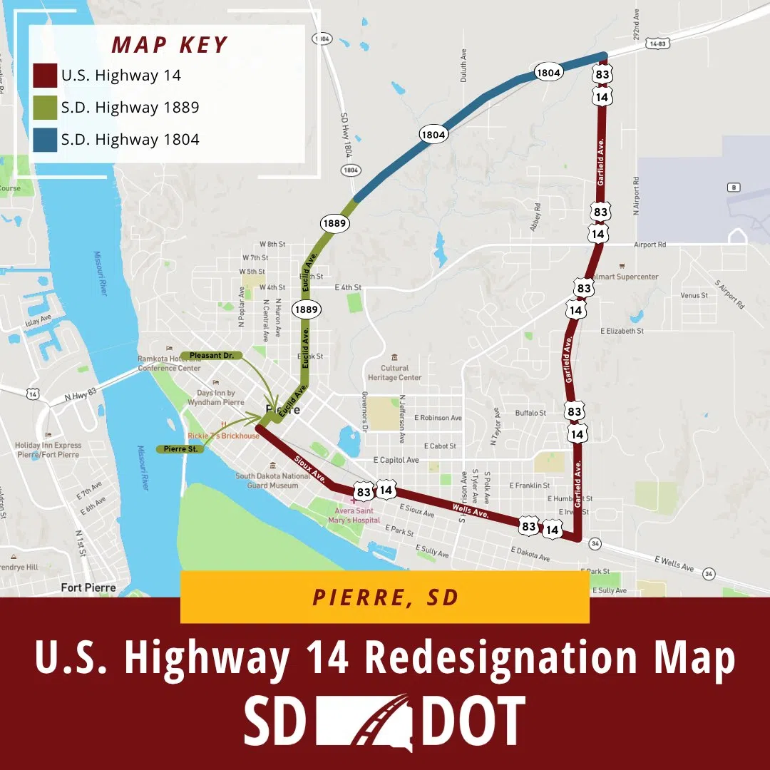 State Department of Transportation Pierre Area Engineer Dean VanDeWiele says during the 2025 lawmaking session, legislators passed and Governor Larry Rhoden signed Senate Bill 39, which renames U.S. Highway 14 going through Pierre as S.D. Highway 1889.