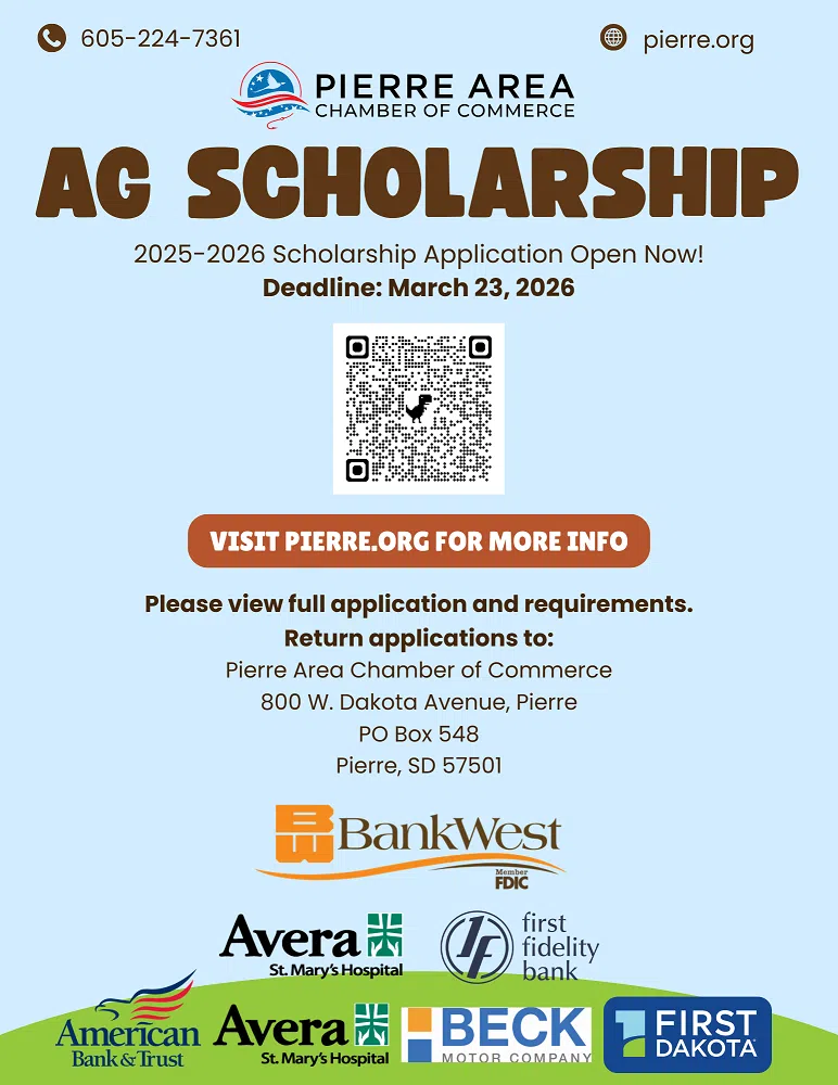 Application information link: https://business.pierre.org/blog/pierre-area-chamber-scoop-5145/post/2025-2026-agri-interest-scholarship-application-42180