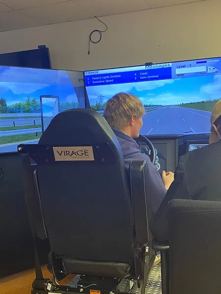Stanley County students in Mr. Neville’s CDL class are shown using the CDL Simulator to practice skills learned during their class. The simulator helps students gain hands-on experience in a safe learning environment. The simulator was purchased last year through a grant. Students pictured are Brendon Bothwell, Mason Stoeser, and Coy Ludemann practicing their skills.