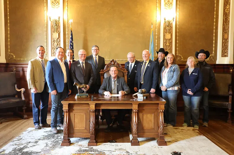 South Dakota Governor Larry Rhoden signs House Bill 1058 while bill supporters watch.