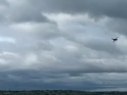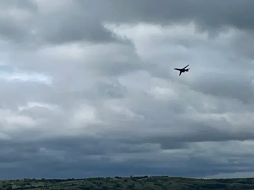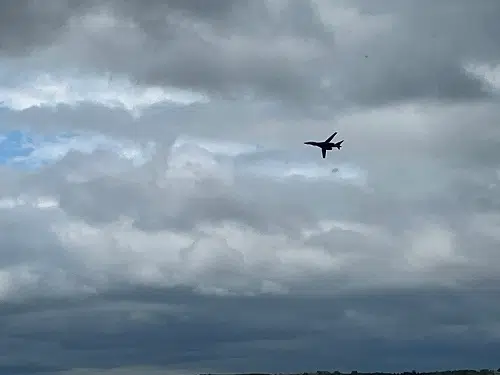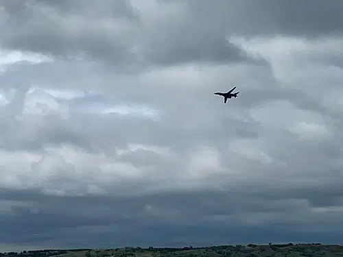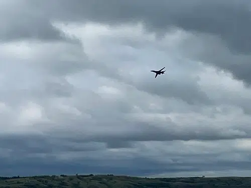 B 1-B Lancer bomber from Ellsworth Air Force Base approaching a flyover of the Oahe Dam on its way to flying over Deadwood Avenue in Fort Pierre July 4, 2023.