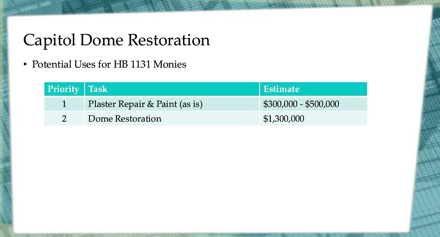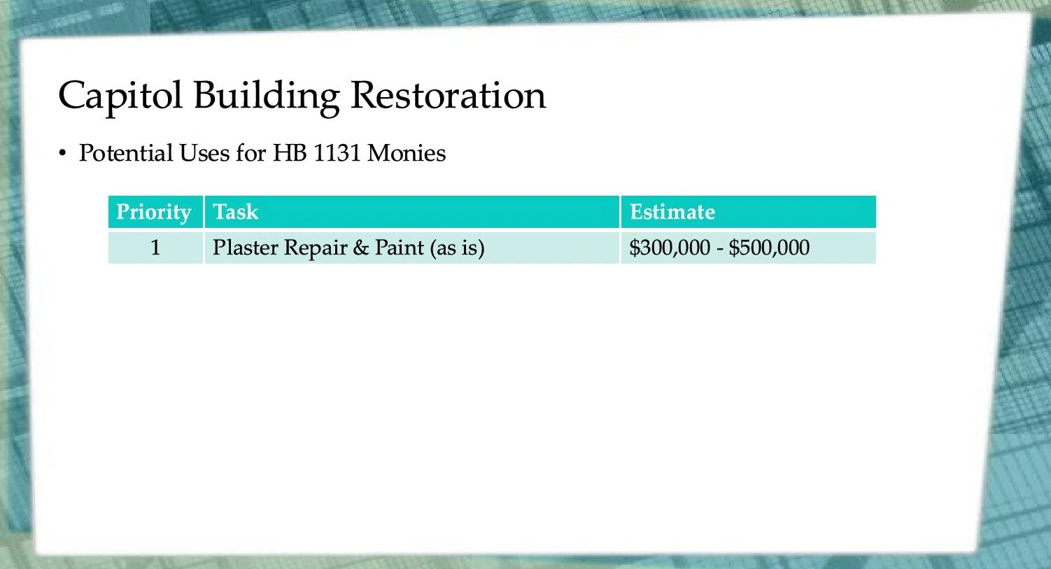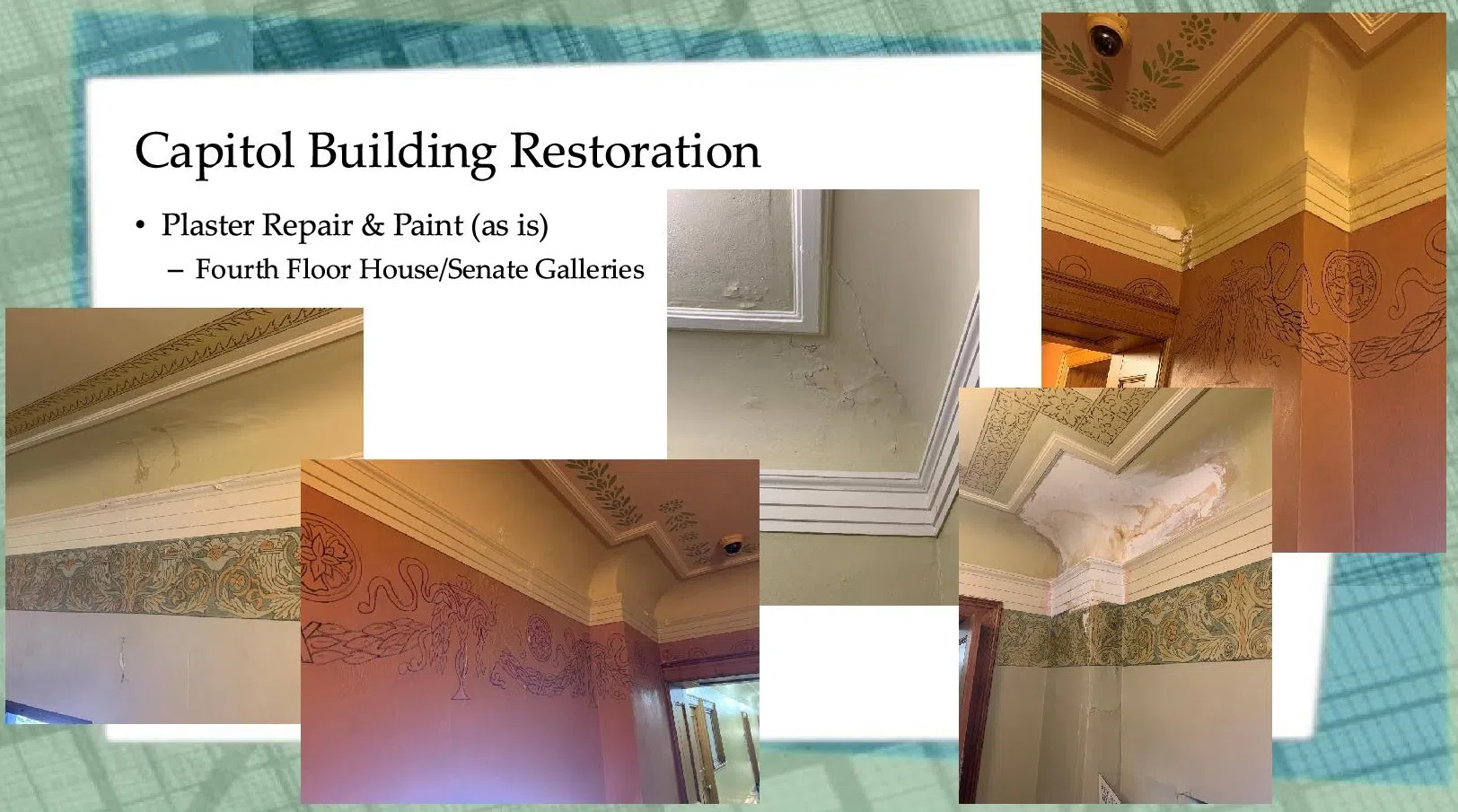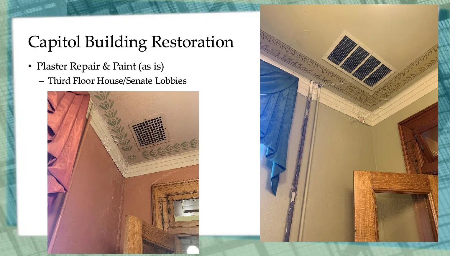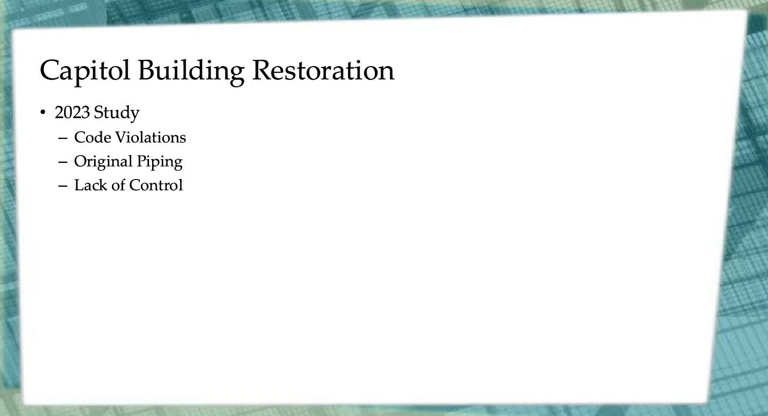 Day said utility study done two years ago showed most of the plumbing in the Capitol is original and doesn’t meet current building code requirements.