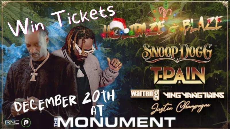 WHO IS READY TO WIN SOME CONCERT TICKETS!!! DRG MEDIA GROUP IS GIVING YOU A CHANCE TO WIN TICKETS TO SNOOP DOGG’S HOLIDAZE OF BLAZE! FEATURING T-PAIN, WARREN G, YING YANG TWINS AND SPECIAL GUEST JUSTIN CHAMPAGNE AT THE MONUMENT ON DECEMBER 20TH. REGISTER DAILY UNTIL MIDNIGHT ON THURSDAY NOVEMBER 10TH. WINNERS WILL BE ANNOUNCED ON FRIDAY NOVEMBER 11TH! SO HEAD TO DRGNEWS.COM AND REGISTER TODAY!