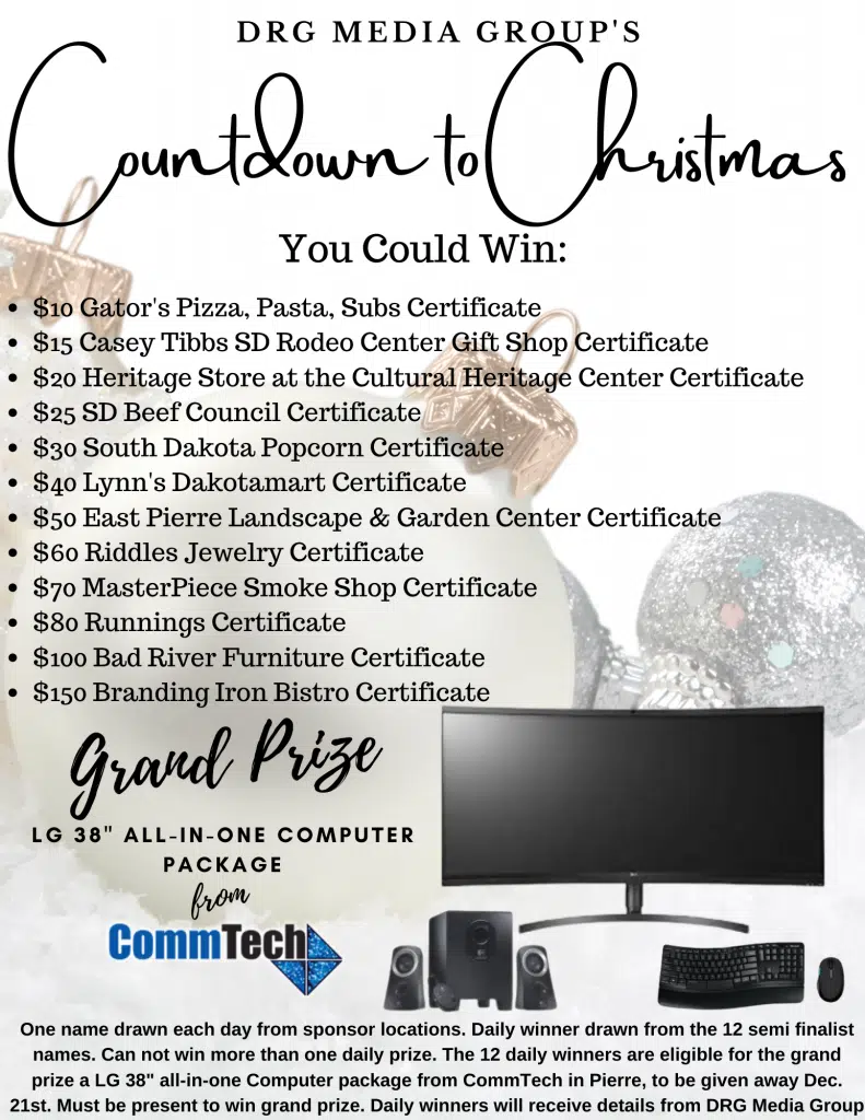 COUNTDOWN TO CHRISTMAS…DRG MEDIA GROUPS SPIN ON THE TWELVE DAYS OF CHRISTMAS, GIVES YOU A CHANCE TO WIN…WITH 12 DAILY WINNERS, JUST LIKE IN THE SONG! ALL YOU HAVE TO DO IS VISIT OUR SPONSOR LOCATIONS NOW UNTIL DECEMBER 16TH AND REGISTER: GATORS PIZZA-PASTA-SUBS, THE CASEY TIBBS SD RODEO CENTER GIFT SHOP, THE HERITAGE STORE, COMMTECH, SOUTH DAKOTA POPCORN, LYNN’S DAKOTAMART, EAST PIERRE LANDSCAPE AND GARDEN CENTER, RIDDLE’S JEWELRY, MASTERPIECE ONE STOP SMOKE SHOP, RUNNINGS, BAD RIVER FURNITURE AND BRANDING IRON BISTRO. DECEMBER 1ST THROUGH DECEMBER 16TH ONE NAME WILL BE DRAWN EACH DAY FROM OUR SPONSOR LOCATIONS, YOU CAN ALSO ENTER TO WIN AT DRGNEWS.COM BROUGHT TO YOU BY THE SD BEEF COUNCIL! PRIZES INCREASE WITH EACH SUCCEEDING DAY..JUST LIKE THE 12 DAYS OF CHRISTMAS SONG BUT BETTER. THEN, ALL 12 DAILY WINNERS AND 1 WILD CARD WINNER FROM THE COMMTECH REGISTRATION BOX WILL BE REGISTERED TO WIN A GRAND PRIZE..A LG 38” ALL IN ONE COMPUTER PACKAGE WITH SURROUND SOUND FROM COMM TECH IN PIERRE, GIVEN AWAY ON DECEMBER 21ST. SEE THE FULL DETAILS BY VISITING DRGNEWS.COM