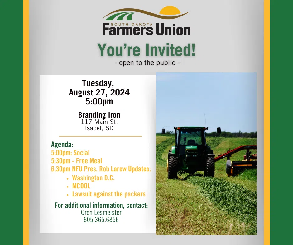 Open to the Public. Social at 5 p.m. with a free meal at 5:30 p.m. For questions contact Oren Lesmeister at 605-365-6856.